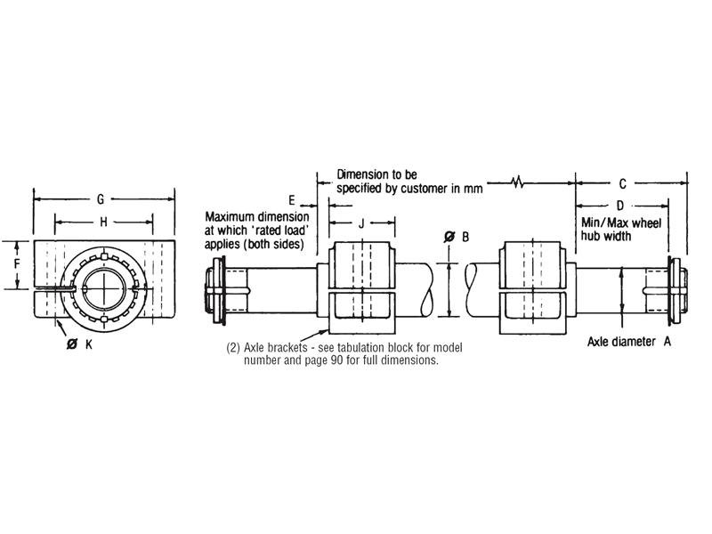 This "A" series axle assemblies are for mounting pairs of wheels fitted with roller or ball bearings, the lock nuts and tab washers providing adjustment for opposed taper roller bearings. The "A" series axles take standard applied wheel loads (per wheel) from 1500kg to 12000kg. Brauer also goes beyond this standard load range if a customer has a specific need. The wheel bearing axle diameter "A" and the max/min wheel hub width "D" should be selected to match up with the wheels bearing bore and the wheels width at the bearings. The two large supporting axle brackets are slotted and slide along the main axle diameter allowing for lateral positioning of the axle and wheels on installation. The "A" series axle assemblies are supplied complete with 2 axle brackets, 2 bearing retainer/adjustment nuts and 2 tablock washers.