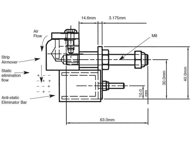 When compressed air is used to blow away dust, its efficiency is limited, especially if the dust has a static charge which holds the dust to the product or draws it back even when blown. The solution is to use a standard Brauer Strip Airmover with an anti static eliminator bar attached. This will shower the product with ionised air and eliminate the electron charge and thus allowing high quality product cleaning. |