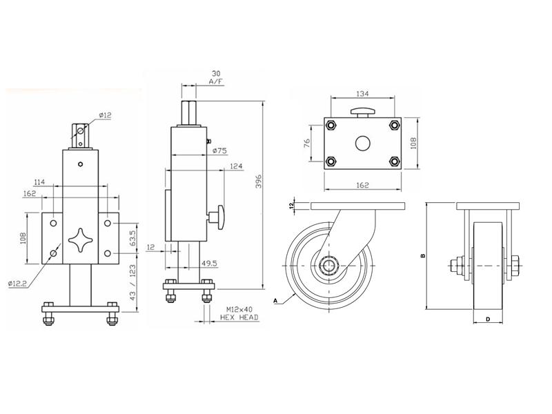 Brauer have developed a range of jacking units expanding further our comprehensive range of heavy duty castors and wheels. The jacking units are highly adaptable across a broad range of environments and applications. Many options are available giving this new product unsurpassed flexibility for the worlwide market place. Availability and delivery is enhanced due to products being totally manufactured within the wheels and castors division based in the UK. The Brauer robust design provides load rating up to 1600kg per unit with an integral swivel mechanism incorporated into jacking castor. Designed to suit our 'MG' fixed castor range. Wheel options are from 150mm to 300mm wheel diameter. Material for wheel options are: steel, polyurethane and nylon. Jacking units now form part of Brauer's comprehensive range of wheels and castors.
