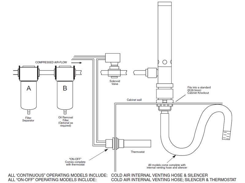 Brauer cabinet coolers provide low cost cooling which is environmentally friendly for the internal workings of electrical and electronic control cabinets. The cooler keeps the temperature within the electrical cabinet at safe working levels, with the use of its vortex tube which turns compressed air into cold air without the use of any moving parts, hence very low future maintenance. |