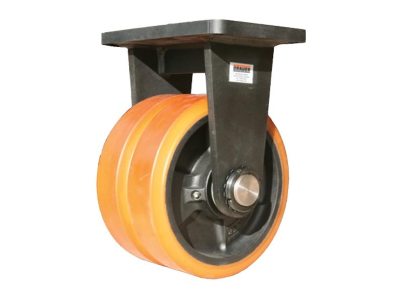 Heavy duty industrial castor, fitted with two special Brauer Vulkollan Polyurethane 380mm diameter by 100mm wide, P-O-B (press-on-band) wheels. The HQZ heavy duty industrial swivel castor has a load rating of 7300kg, the load is limited by the wheels/bearings to 7200kg. For higher loads consider using different wheels/bearings. The HQZ heavy duty series castors have directional lock fitted as standard. |