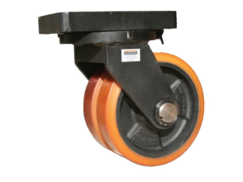 Heavy duty industrial castors fitted with two special Brauer Vulkollan 'Heavithane' Polyurethane 300mm or 250mm diameter by 75mm wide, P-O-B (press-on-band) wheels. The TQZ swivel heavy duty castor has a load rating of 5100kg and the load is limited by the wheels/bearings to 5000kg for the 300mm diameter wheels and 4000kg for the 250mm diameter wheels. For higher loads consider using different wheels/bearings. The TQZ range of castors has directional lock fitted as standard. |