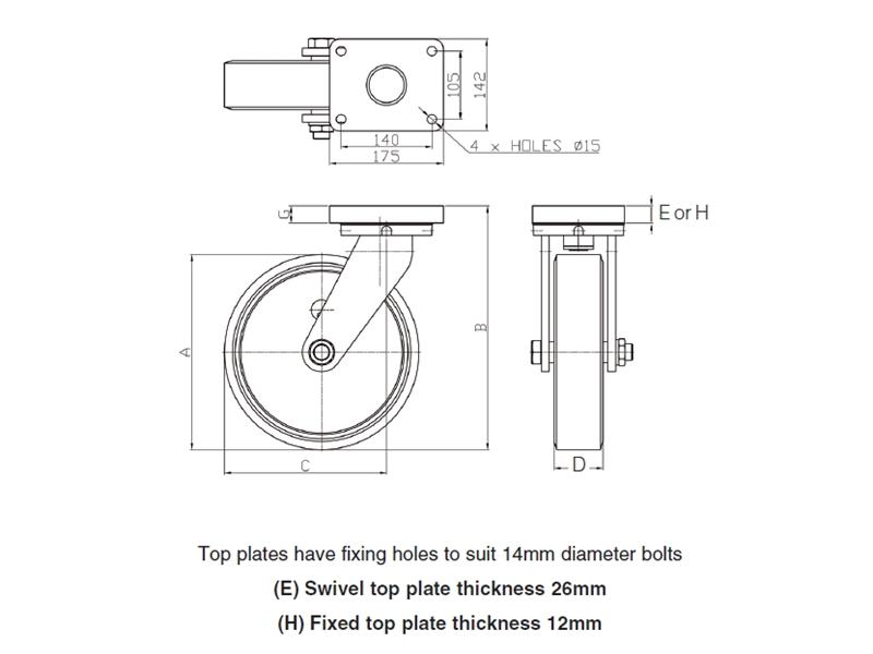 The WG range of Brauer heavy duty industrial Castors are possibly the most popular of the Brauer range, taking a maximum load of 3000kg (limited by wheel choice) particularly when fitted with the very high grade durable and tough Brauer Vulkollan 'Heavithane' (TM) polyurethane wheels. The WG range of heavy duty castors comes in Swivel and Fixed industrial castor brackets with Vulkollan polyurethane "Heavithane" wheel diameters from 150mm to 300mm and wheel widths from 50mm to 75mm. Brauer will also modify to a specific customer design should the need arise. The WG range of industrial castors are available with individual wheel locks (W) and individual swivel locks (D) if either or both are required simply add "D" or "W" as suffix's to the part numbers below. |