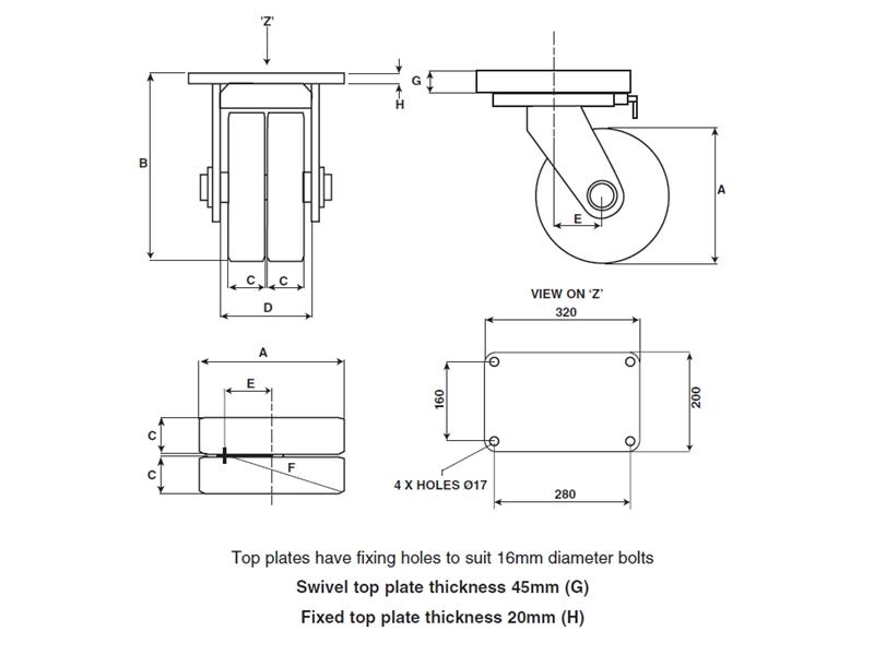 Heavy duty industrial castors fitted with two special Brauer Vulkollan 'Heavithane' Polyurethane 300mm or 250mm diameter by 70mm or 75mm wide, direct bond polyurethane wheels. The TQZ swivel heavy duty castor has a load rating of 5100kg and the load is limited by the wheels/bearings to 4600kg for the 300mm diameter wheels and 4000kg for the 250mm diameter wheels. For higher loads consider using different wheels/bearings. The TQZ range of castors has directional lock fitted as standard. |